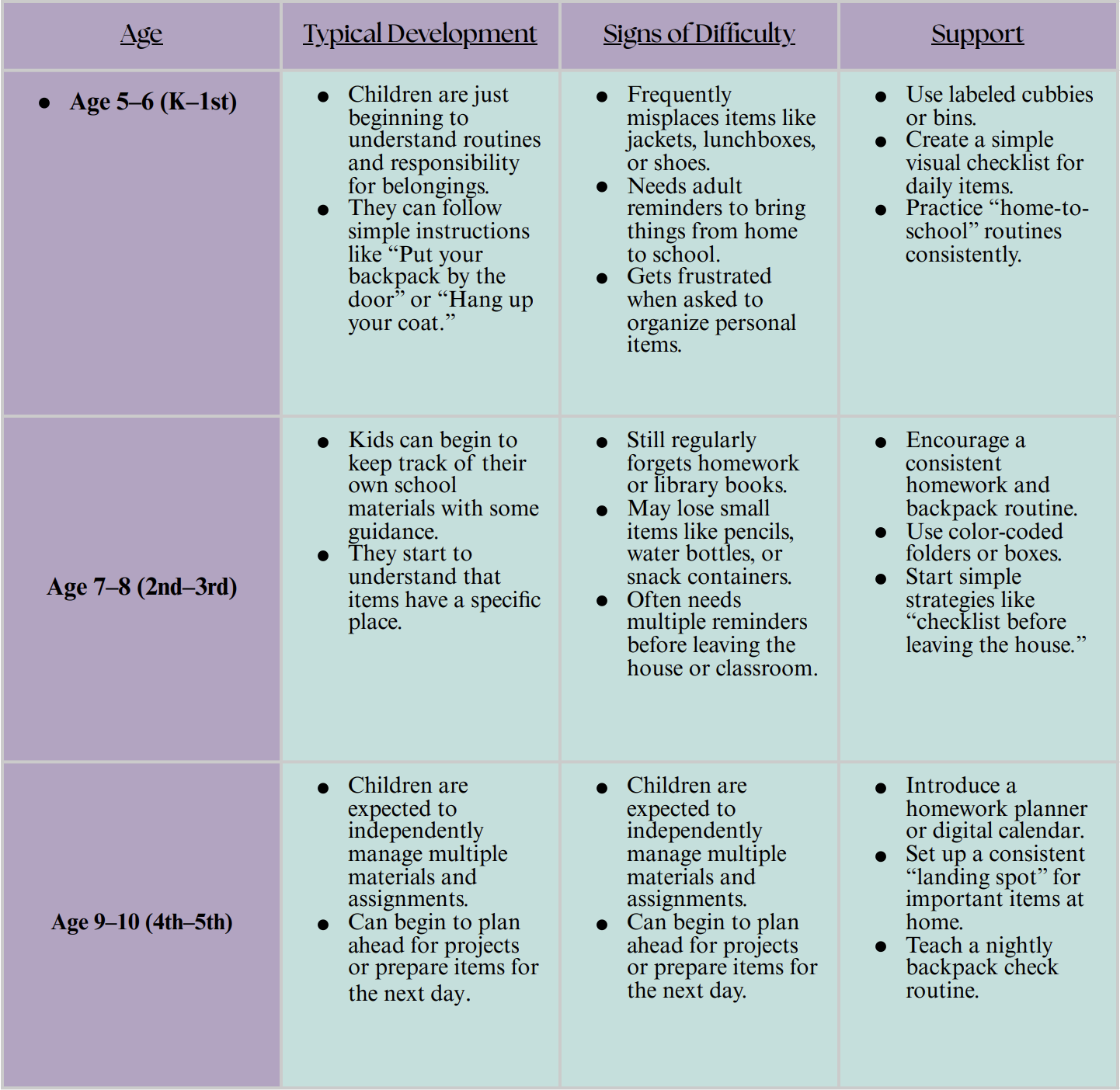 It’s incredibly common for parents to interpret certain behaviors as defiance. When a child refuses to clean their room, ignores reminders, loses the same item for the third time in a week, or bursts into tears over a simple chore, the automatic assumption is often: “They don’t care,” or “They’re being disrespectful.” But in reality, many of these challenging moments stem not from unwillingness—but from executive functioning skill gaps, especially in planning and organization. Kids aren’t pushing back on purpose; they’re overwhelmed, under-resourced, or unsure where to start. When we view these moments through a skill-based lens rather than a behavioral one, everything changes. Here is a helpful table outlining the planning and organizational skills of children by age and ways to offer support to those who may need a boost in skill development.